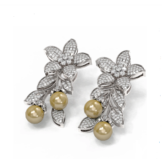 Luxury Designer Brand Earring 18K White gold, Earring Size is 3/4x1 3/4 inch Long, Earring measuring approx. 3/4x1 3/4 inch, weighing in total approx. 14 grams. stamped 18K, Main stone carat total weight containing 4 pieces of High Luster color with AA quality Round shape cut Pearl , Stone #2 3.05 carat total weight containing 320 pieces of I-J color with VS/SIquality Round shape cut Diamond