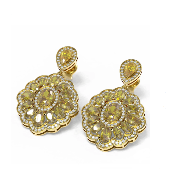 Luxury Designer Brand Earring 18K Yellow gold, Earring Size is 1x1 3/5 inch Long, Earring measuring approx. 1x1 3/5 inch.Main stone 13.25 carat total weight containing 28 pieces of Intense Transparent Yellow color with AAA quality Oval & Pear shape cut Citrine Canary , Stone #2 2.12 carat total weight containing 194 pieces of I-J color with VS/SIquality Round shape cut Diamond