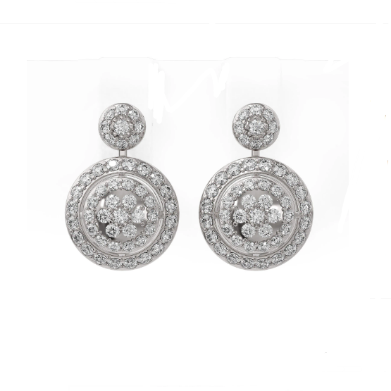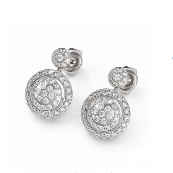 Luxury Designer Brand Stud 18K White gold, Stud Size is 1/2x3/4 inch Long, Stud measuring approx. 1/2x3/4 inch, Main stone 2 carat total weight containing 100 pieces of I-J color with VS/SI quality Round shape cut Diamond , Stone #2 carat total weight containing pieces of color with quality shape cut