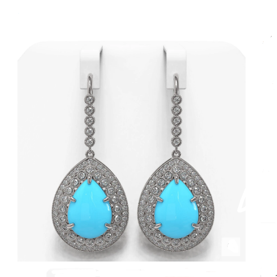 Luxury Designer Brand Earring 18K White gold, Earring Size is 1 1/4 Inch Long, Earring measuring approx. 1 1/4 x 2 Inches, weighing in total approx. 22 grams.Main stone 15 carat total weight containing 2 pieces of Intense Medium Blue Sleeping Beauty color with AAA quality Pear shape cut Turquoise , Stone #2 5.22 carat total weight containing 138 pieces of I-J color with VS/SIquality Round shape cut Diamond