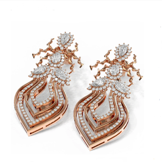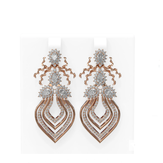Luxury Designer Brand Earring 18K Rose gold, Earring Size is 3/4x1 2/3 inch Long, Earring measuring approx. 3/4x1 2/3 inch,Main stone 2.16 carat total weight containing 2 pieces of I-J color with VS/SI quality Pear shape cut Diamond , Stone #2 2.05 carat total weight containing 204 pieces of I-J color with VS/SIquality Round shape cut Diamond
