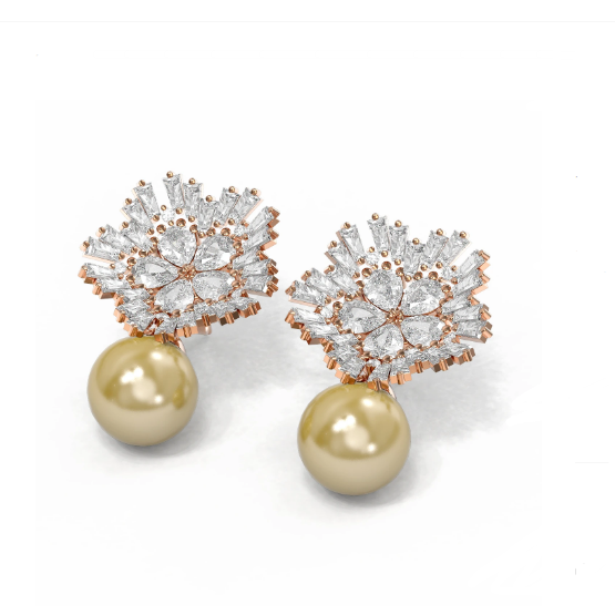 18K Rose Gold Snowflake Floral Four Leaves Golden Pearl Earring