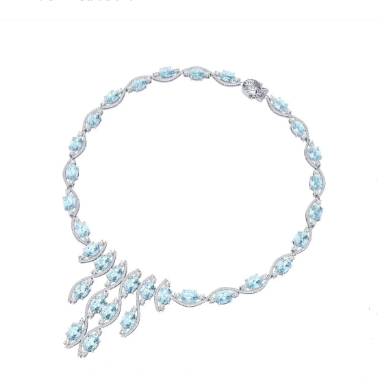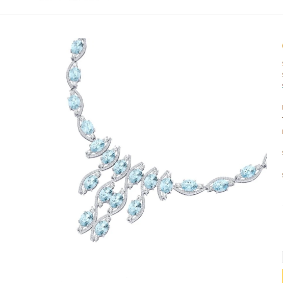 Luxury Designer Brand Necklace 18K White gold, Necklace Size is 16 Inches, Can custom fit length, Necklace measuring approx. 4 1/2 x1 3/4 Inches, Main stone 58.19 carat total weight containing 38 pieces of Translucent Sky Blue color with AAA quality Oval shape cut Topaz Sky , Stone #2 9.93 carat total weight containing 448 pieces of I-J color with VS/SIquality Round shape cut Diamond.
