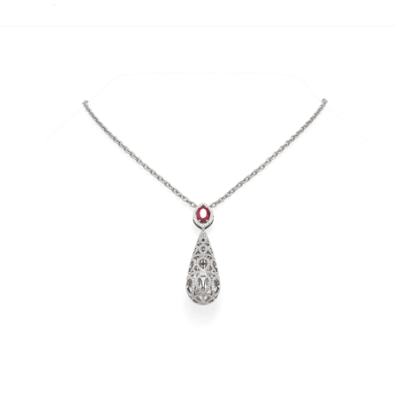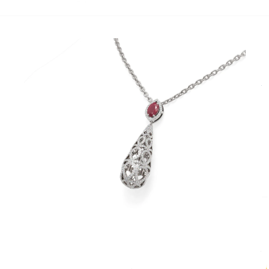 18K White Gold Hollow Filigree Pear Dangling Ruby Diamond Pendant Necklace