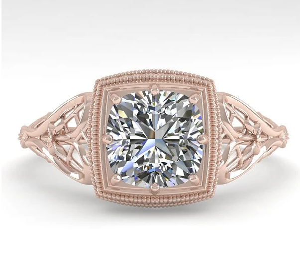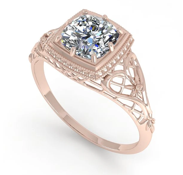 18K Rose Gold 1.0 ctw Cushion Solitaire Diamond Filigree Engagement Ring
