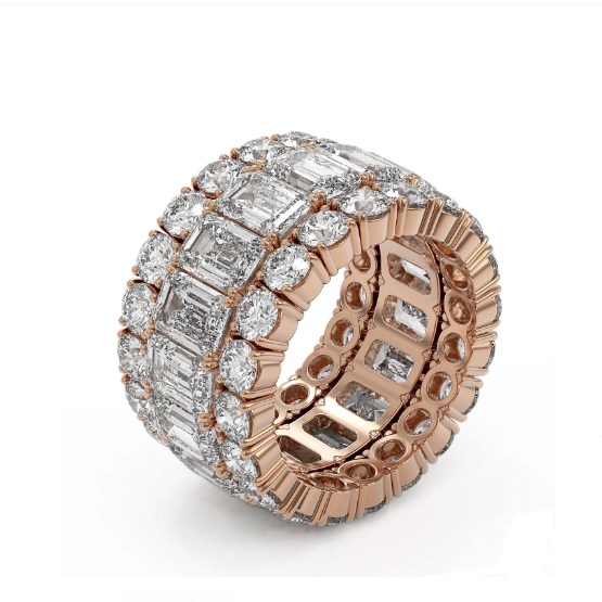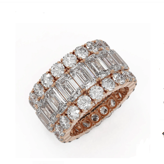 Luxury Designer Brand Wedding Ring 18K Rose gold, Wedding Ring Size is 7, Wedding Ring measuring approx. 1/2x1 inch, weighing in total approx. 18 grams.Main stone 8.67 carat total weight containing 17 pieces of I-J color with VS/SI quality Emerald Cut shape cut Diamond , Stone #2 5.2 carat total weight containing 40 pieces of I-J color with VS/SIquality Round shape cut Diamond